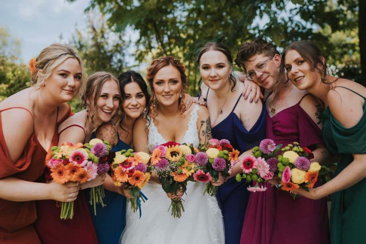 “Our whole theme was colour,” explains Cat. “We just wanted to capture all the bright colours and happiness of summer and I’m so glad we did. It was also much easier not to have to match anything while planning.” From the outdoor ceremony by the lakeside to the reception in the Stone Barn, Cat & Rhys’ wedding was a wonderful riot of epic florals, vibrant details, rainbow lanterns and personalised elements that worked beautifully against the backdrop of Deer’s Leap.